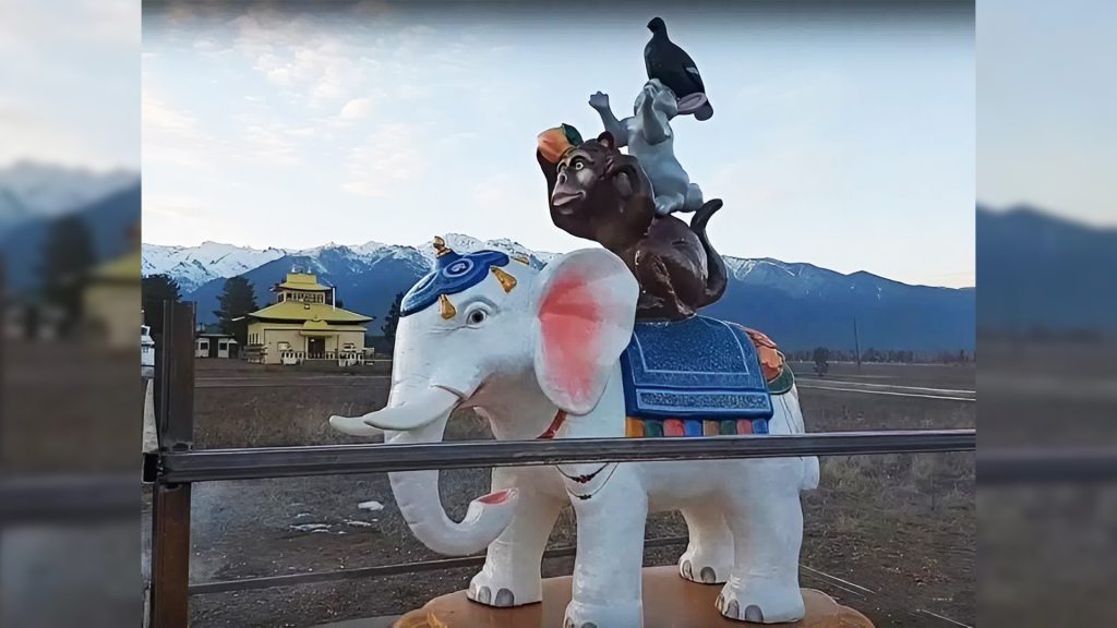 Она представляет из себя пирамиду со слоном, обезьяной, кроликом и птицей. Монумент высотой 2,5 метра разместили у входа в дацан. Настоятель дацана Еши Намжил лама пояснил глубокий смысл этой буддийской притчи.