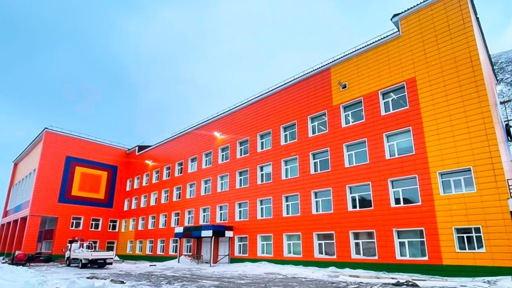 от серых стен к ярким панелям: на Чукотке обновили фасад и спортзал школы‑интерната
