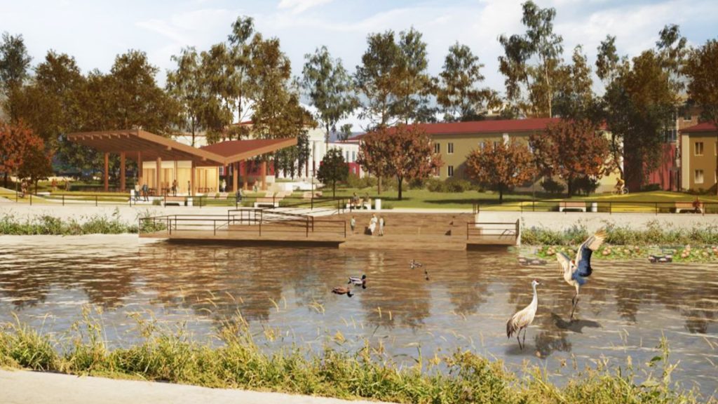 Для активного отдыха обустроят спортплощадку и велодорожки, для спокойного досуга — зону с шахматными столиками. на набережной реки установят пирс и шезлонги, а в воду планируют опустить корзины с лотосами. Кроме того, в парке появится кафе с открытой верандой, комната матери и ребёнка и полноценная ливнёвка.