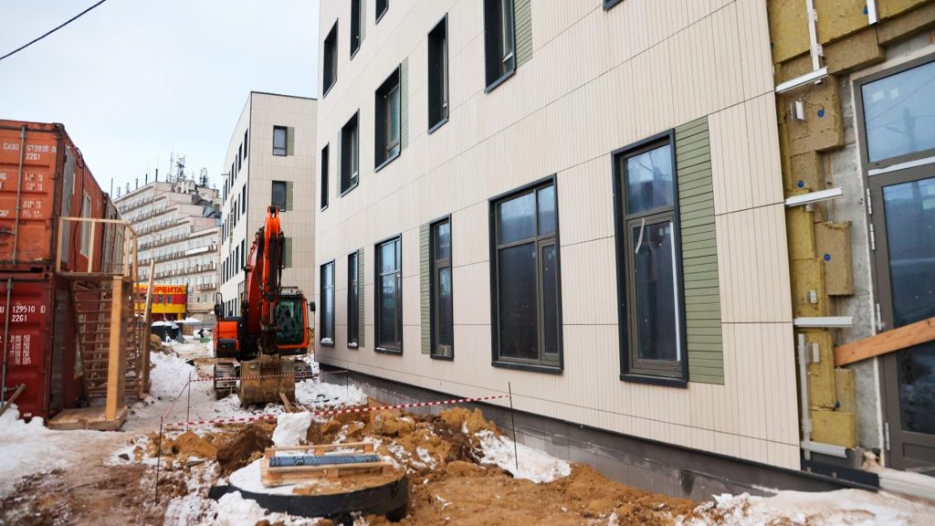 По словам подрядчика, сейчас объект уже готов на 75%. на текущем этапе выполнены работы с кровлей, фасадом и наружными инженерными сетями, обустраиваются внутренние сети. в феврале планируется подключить поликлинику к централизованному отоплению и развернуть отделочные работы.