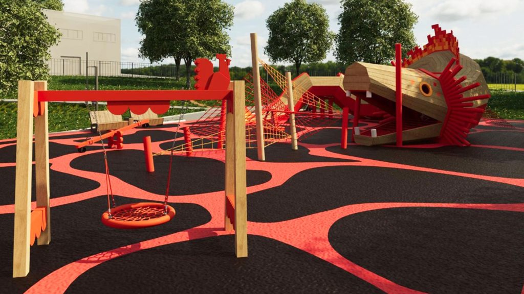 В рамках второго этапа благоустройства будут созданы несколько ключевых зон. Так, для малышей от 3 до 7 лет построят площадку «Вулкан», а для детей старше 7 лет — комплекс «Дракон». Обе зоны оборудуют небольшими скалодромами, каруселями и качелями-балансирами.
