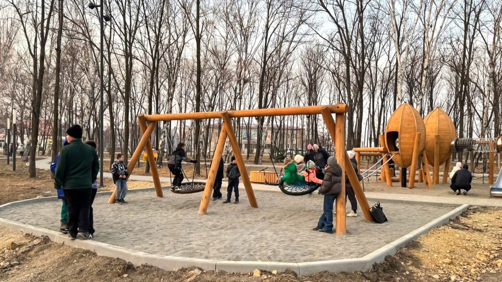 Для семейного отдыха обустроены детские и спортивные площадки, сцена, амфитеатр, теневые навесы и велопарковки. Есть и тихие зоны для прогулок, арт-объекты, уличный книжный шкаф и стела при входе. Парк стал новым центром притяжения для жителей.