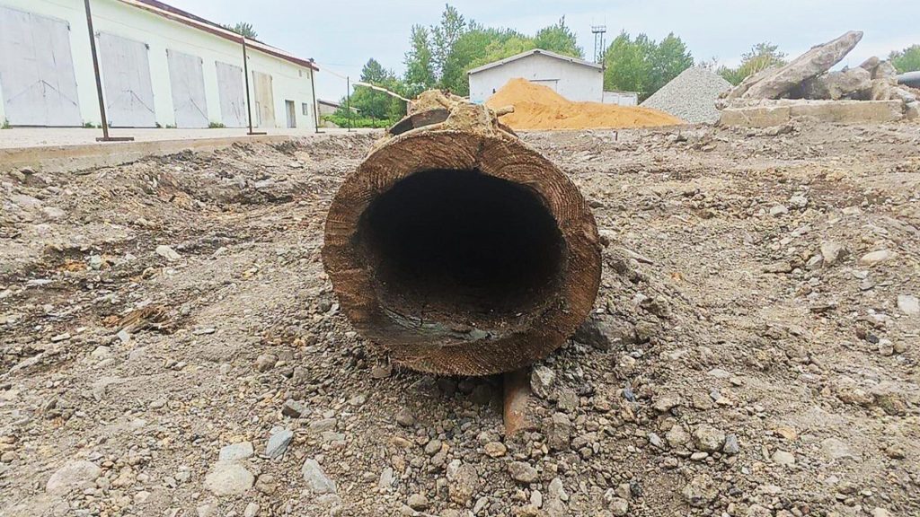 Уникальная находка была сделана во время строительных работ на улице Бумажной в Южно-Сахалинске. Работники «Сахалинской коммунальной компании», занимаясь возведением новой газораспределительной установки, наткнулись на необычную конструкцию — фрагмент водопровода, выполненного полностью из дерева.