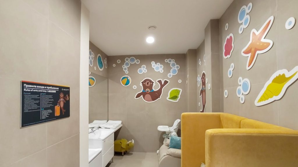 Помещение расположено между 5 и 6 выходами на посадку. Ранее родители могли воспользоваться только семейным туалетом в общей зоне аэропорта. Теперь комната для пеленания и кормления доступна прямо в «стерильной» зоне.