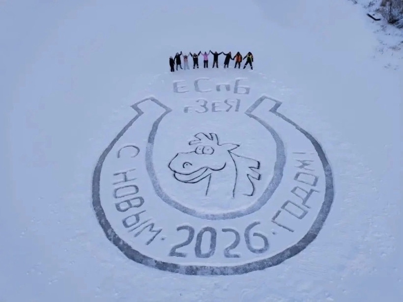 На льду озера Исток, среди сопок, появился символ 2026 года — лошадь в обрамлении подковы с новогодними поздравлениями.