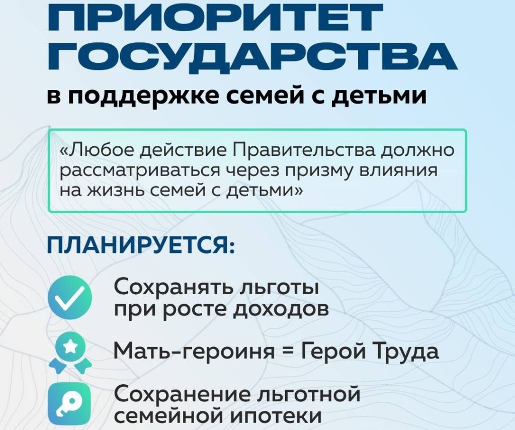 Это значит, что льготы для многодетных должны сохраняться даже при росте их доходов. Попытки пополнить бюджет за их счёт недопустимы. а статус «Мать-героиня» будет приравнена к званию Героя Труда.