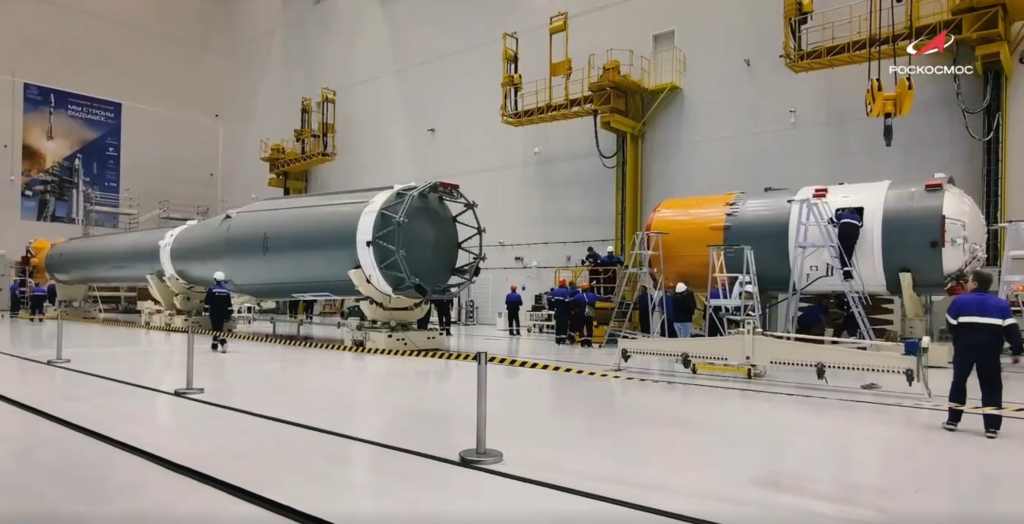 На космодроме Восточный в Амурской области завершили ключевой этап подготовки к запуску. Специалисты состыковали центральный и боковые блоки ракеты-носителя «Союз-2.1б» — так называемая сборка «в пакет».
