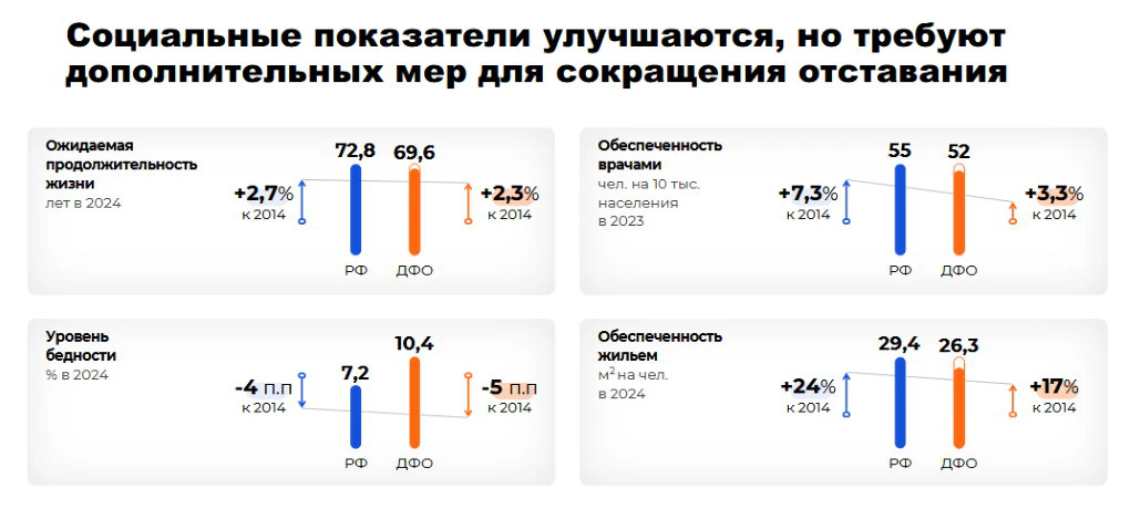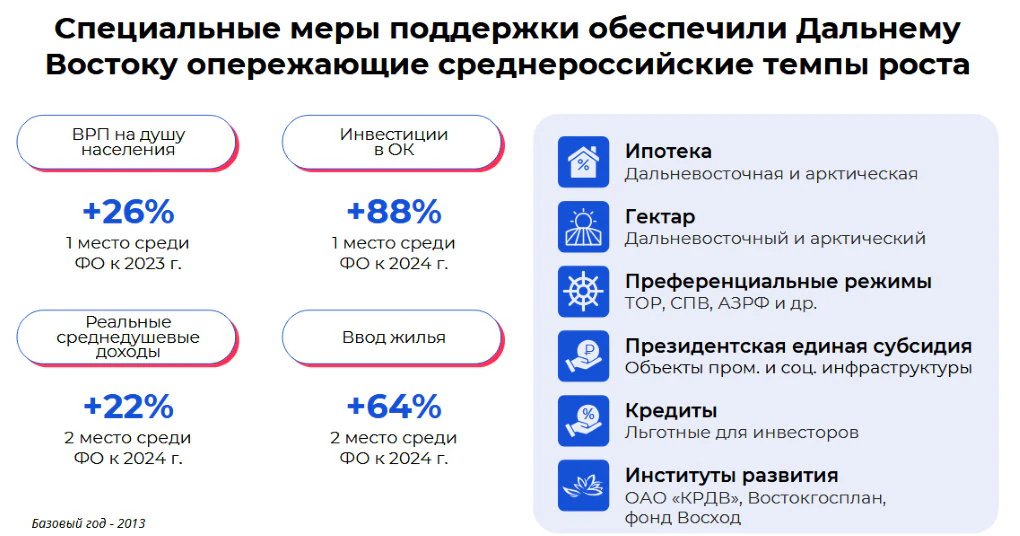 В 2025 году ДФО лидирует среди округов по темпам роста инвестиций в основной капитал (+88% к 2024 г), занимает второе место по вводу жилья (+64% к 2024 г.) и росту реальных среднедушевых доходов населения (+22% к 2024 г.).