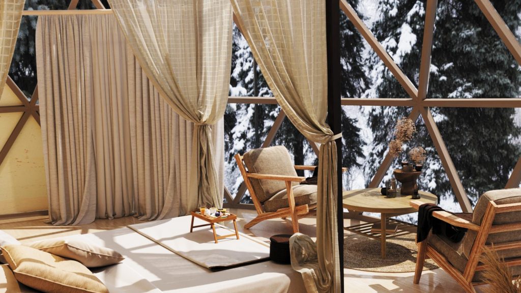 Глэмпинг-курорт рассчитан на единовременный приём 186 гостей. Номерной фонд представлен категорией «4 звезды», включая модульные дома и отель. Главной фишкой станет термальный спа-комплекс с открытым бассейном, готовый принять путешественников и зимой, и летом. для гостей также построят ресторан, банный комплекс, конференц-зал и обустроят смотровую площадку.