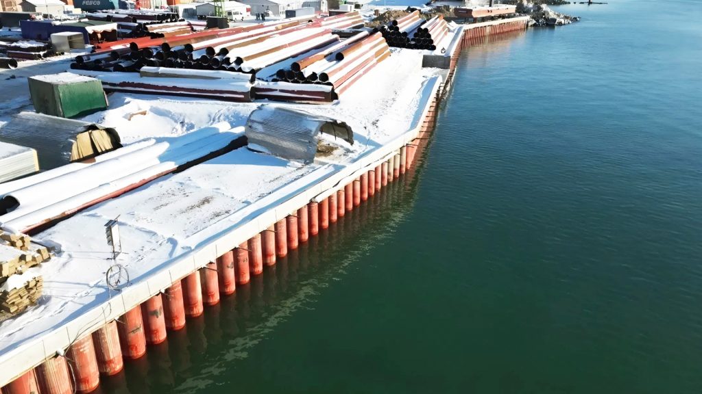 Тем временем на слипе идут основные работы — буровые операции для будущей шпунтовой стенки, отсыпка тела слипа скальным грунтом, погружение свай. Железобетонные и металлические элементы слипа завезены и готовы к монтажу.